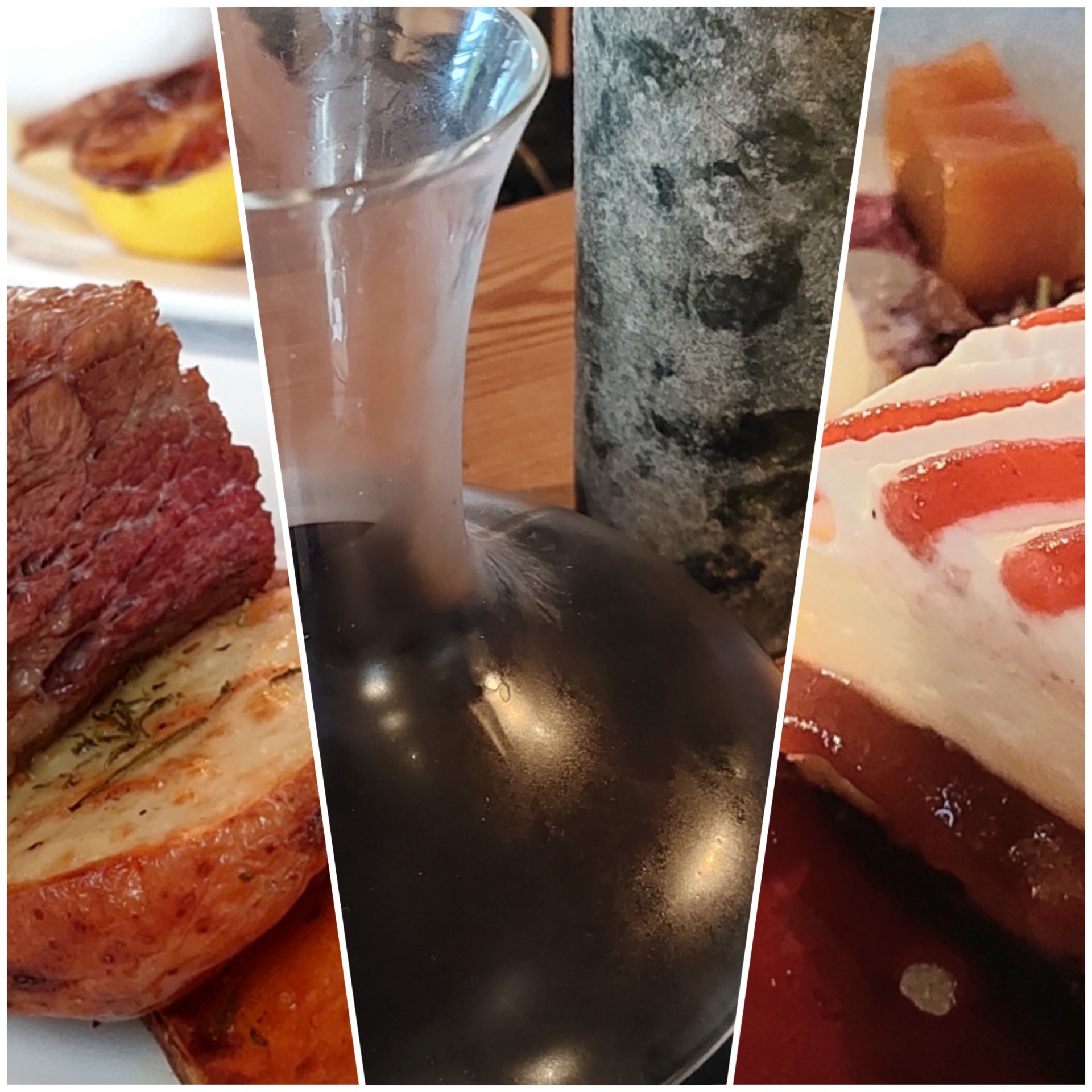Pero ello solo fue el principio de un gran almuerzo. Acto seguido llegó el momento de disfrutar de los principales, que como buenos carnívoros que somos, estuvieron inspirados en ese producto tan bueno con el que podemos contar en nuestro país: la carne vacuna. Una manta de asado a las brasas con papas y boniatos (que debemos confesar, le habíamos echado el ojo cuando llegamos, mientras el asador avivaba el fuego con leña) y la milanesa con ensalada de verdes - algo simple, pero que bien preparado, por naturaleza gusta a todos - llegaron en tiempo y forma a nuestra mesa, mientras la sommelière nos sorprendía invitándonos a probar no uno, sino cuatro vinos muy especiales....
